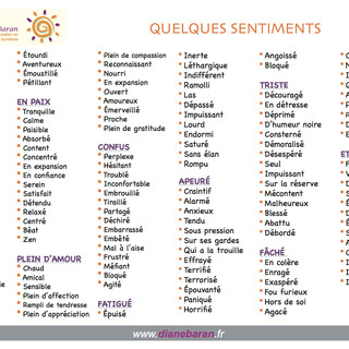 Encore une fois je crois que le plus important c'est l'intention et le sérieux de la démarche qui sont importants et si les maladresses seront nombreuses dans vos tentatives de communiquer avec ce nouvel outil, relevez vous et recommencez, comme le font tous les pionniers ! Aussi, comme il est parfois difficile de pouvoir nommer un sentiment, un émotion, un besoin lorsqu'on en a pas l'habitude en voici donc des liste ci dessous : (pour en télécharger une copie de chaque image :